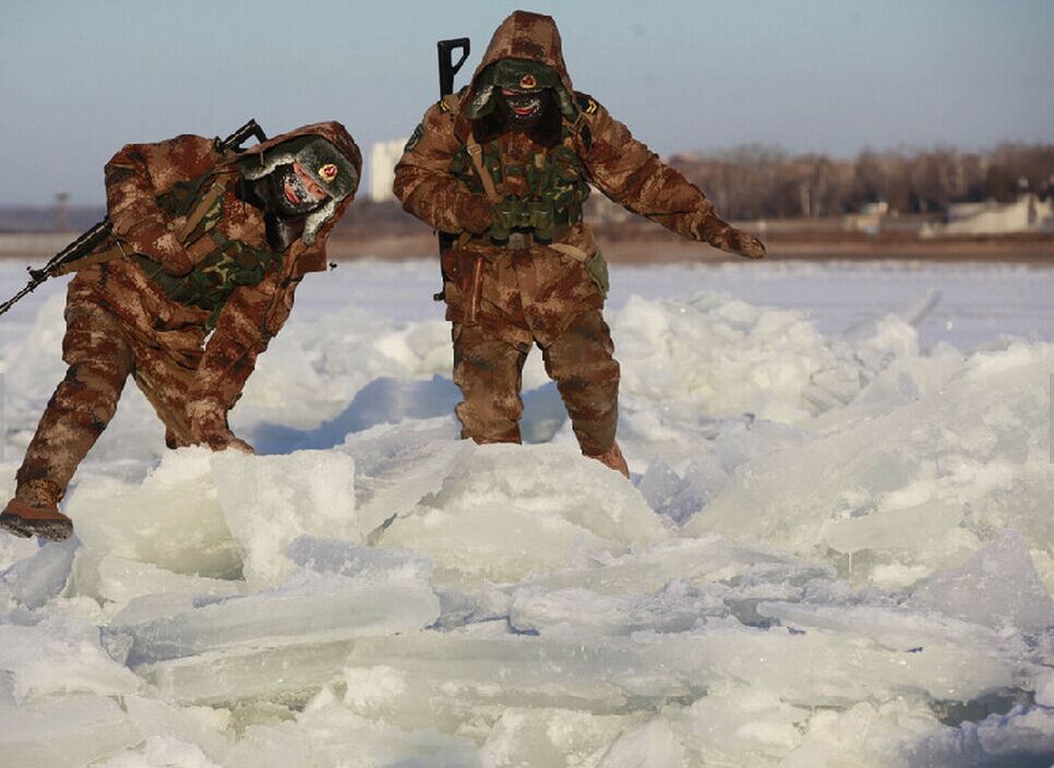 Los guardias fronterizos Xin Guoqiang y Chen Sheng toman posición en una trinchera de hielo para vigilar a los inmigrantes ilegales que quieren entrar a Rusia desde Heihe, provincia de Heilongjiang. Durante la temporada de invierno, la temperatura en Heihe puede llegar a 30 grados bajo cero.