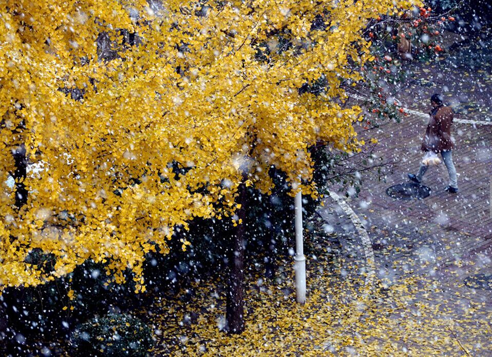Un turista camina a través de la sección Juyongguan de la Gran Muralla, cubierta de nieve.