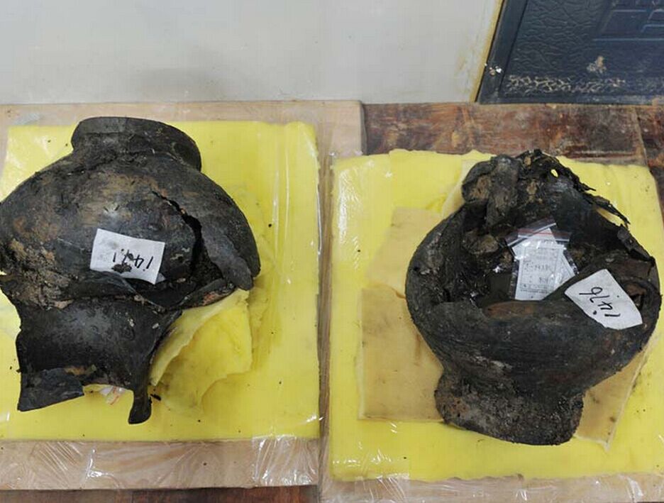 Dos ollas de bronce fueron desenterradas de la tumba del marqués de Haihun, en Nanchang, capital de la provincia oriental china de Jiangxi, el 21 de noviembre de 2015.