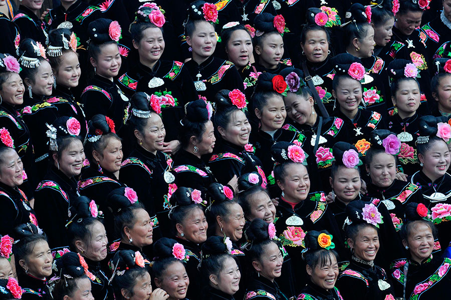 Cientos de mujeres Miao que viven fuera del pueblo volvieron a casa con regalos para sus madres y familiares. [Foto: Qin Gang]