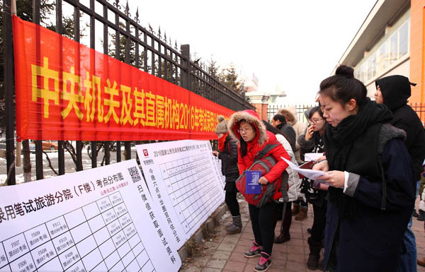 Los solicitantes buscan sus asientos en las listas de un centro de examen en la ciudad de Changchun, provincia de Jilin, el 29 de noviembre. [Foto/IC]