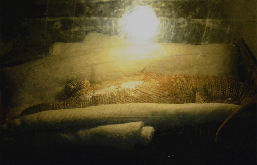 Un lagarto entre telas de algodón y bajo una bombilla de calefacción en un zoológico de Anqing, en la provincia de Anqing, el 23 de noviembre de 2015. Reptiles como los lagartos y las serpientes son vulnerables al frío. Los zoológicos preparan zonas especiales para estos reptiles en invierno. [Foto/IC]