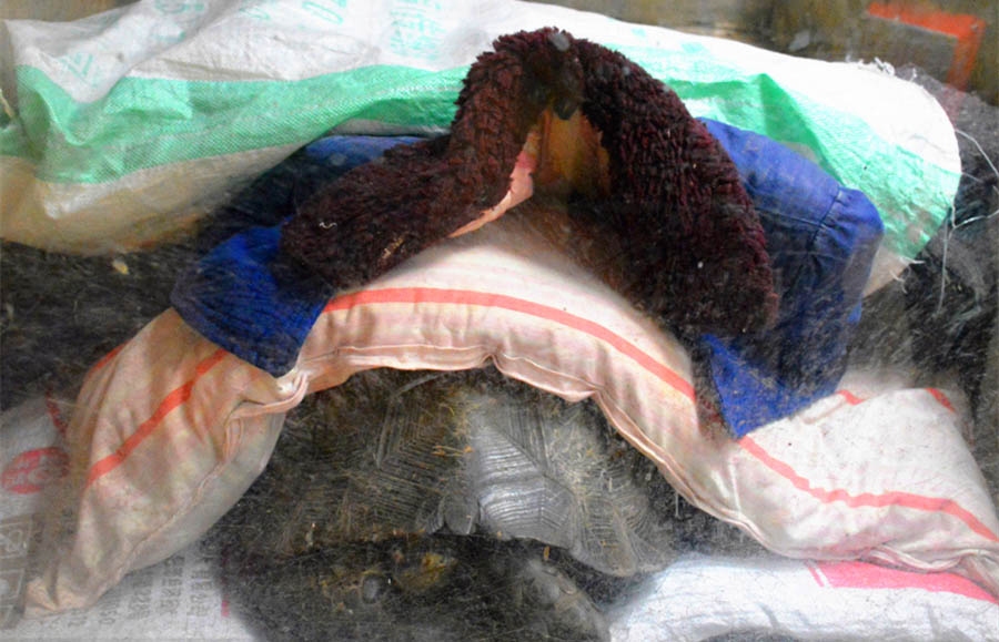 Una tortuga en estado de hibernación cubierta con mantas de algodón en un zoológico de Anqing, provincia de Anhui, el 23 de noviembre de 2015. [Foto/IC]