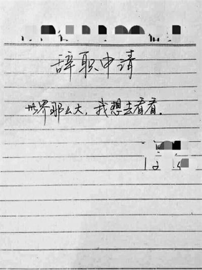 Este a?o se difundió una carta de renuncia titulada "El mundo es grande y quiero echar un vistazo". La autora es un profesora llamado Gu Shaoqiang, empleada de la Escuela Secundaria Experimental de Henan. Después de tomar su decisión de salir a conocer el mundo, Gu hizo las maletas y partió. Su coraje generó admiración y respeto entre los internautas chinos.