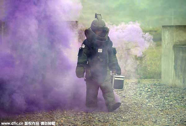 Un especialista sale de un sitio explosivo traje durante el entrenamiento. [Foto/IC]