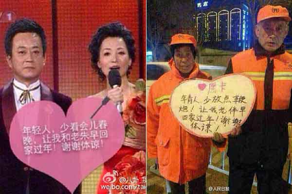Pekín, 18/12/2015(Pueblo en Línea)-Durante el Festival de Primavera de este a?o, una foto que muestra a dos barrenderos en una calle con un cartel pidiendo a la gente joven que quemen menos fuegos artificiales para terminar antes de limpiar y poder regresar a casa se convirtió en un fenómeno viral. La imagen ya ha sido vista más de 1,38 millones de veces en Weibo.