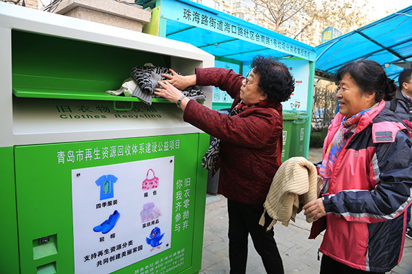 Las personas depositan la ropa usada en un contenedor de reciclaje en el distrito Shinan de Qingdao. [Foto/chinadaily.com.cn]