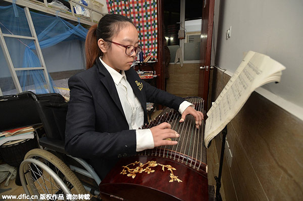 Huang Meihua toca en su casa el Guzheng, instrumento tradicional chino. [Foto: IC]