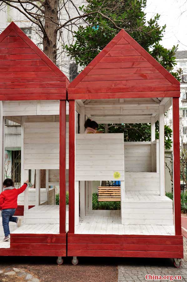 Dos ni?os juegan en una caba?a de madera construida con tablones en la zona antigua de Shanghai en el distrito de Yangpu, que ha despertado con un nuevo rostro. [Foto: Zhou Dongchao]
