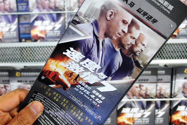 Folleto de la película más taquillera de Hollywood en 2015 en China, Fast and the Furious 7, que recaudó 2.400 millones de yuanes (370 millones de dólares) en taquilla. [Foto de China Daily]