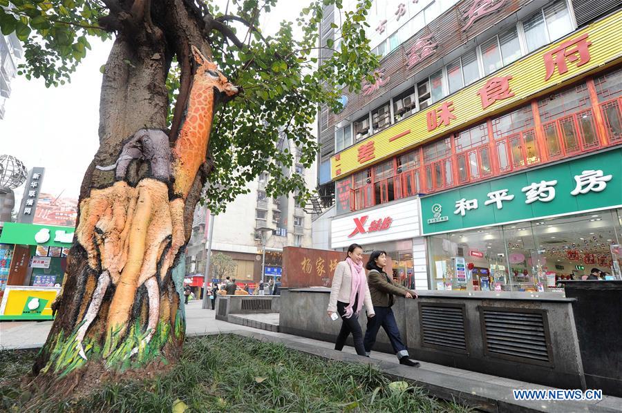 La gente camina por la primera calle temática del arte del graffiti en Chongqing, el 5 de enero de 2016. (Xinhua/Tang Yi)