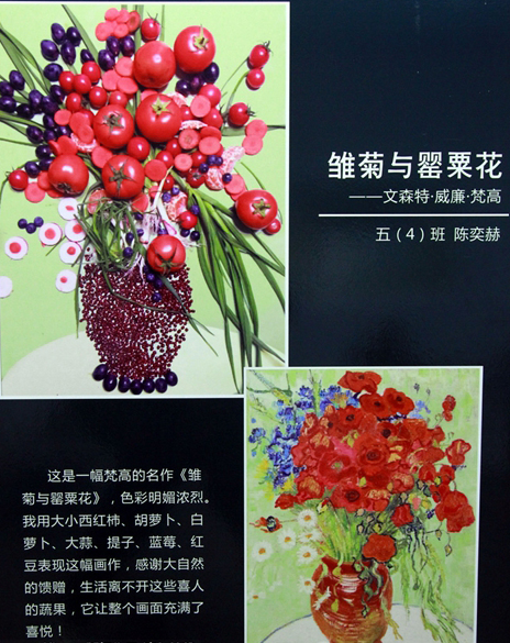 Un alumno utiliza tomates, rábano blanco, habas rojas y otros alimentos para recrear Still Life, Vase with Daisies and Poppies del pintor holandés Vincent van Gogh.
