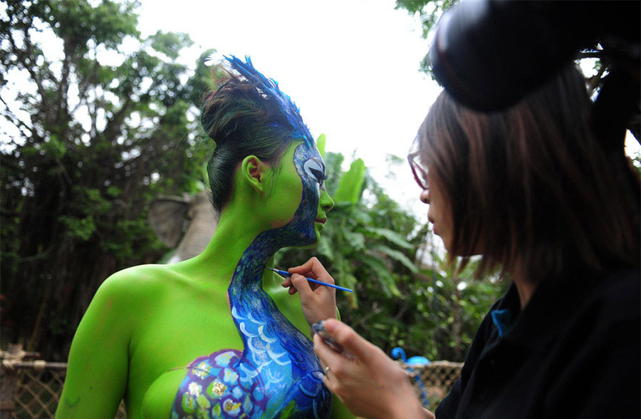 Artista pinta a una voluntaria en el zoológico en la ciudad de Sanya, provincia de Hainan, el 10 de enero de 2016.