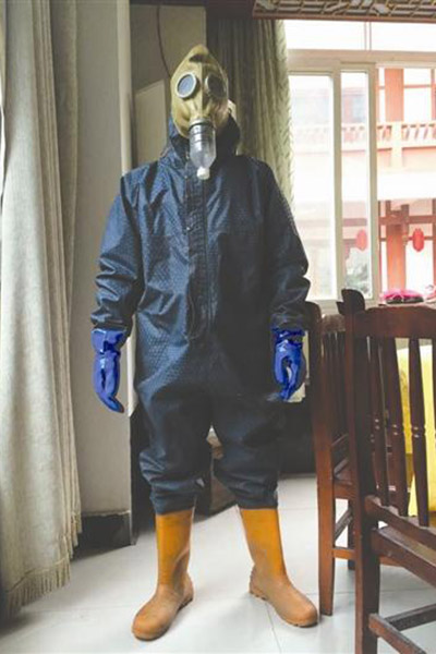 A través de los a?os, Huang dise?ó un traje hermético que consiste en un equipo conectado a un par de guantes,a un sombrero y demás accesorios. El canal para respirar lo construyó con una botella de plástico. También incorporó en el calzado de trabajo algunas garras de hierro, bien afiladas, para lograr trepar hasta lo más emcumbrado de los árboles.