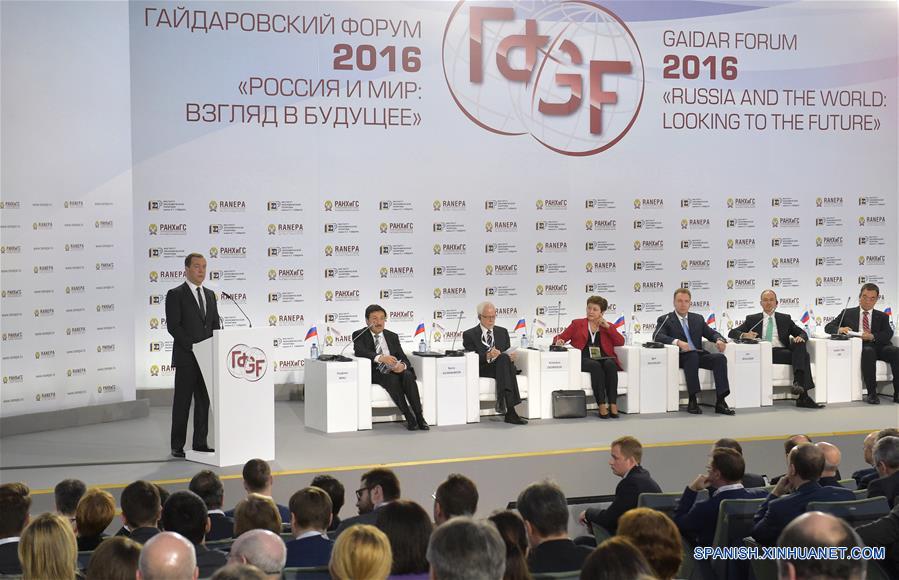El primer ministro ruso, Dmitry Medvedev, en el Foro Gaidar en Moscú, Rusia, el 13 de enero de 2016. La economía de Rusia enfrentará nuevos desafíos este a?o debido a los bajos precios del petróleo y a las sanciones económicas en su contra, pero tiene todas las condiciones necesarias para salir de la crisis, afirmó el miércoles el primer ministro ruso, Dmitry Medvedev. (Xinhua / Sputnik)