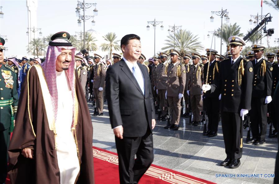 El presidente de China, Xi Jinping asiste a una ceremonia de bienvenida celebrada por el rey de Arabia Saudí Salman bin Abdulaziz Al Saud antes de sus conversaciones en Riad, Arabia Saudita, 19 de enero de 2016. (Xinhua / Ju Peng)