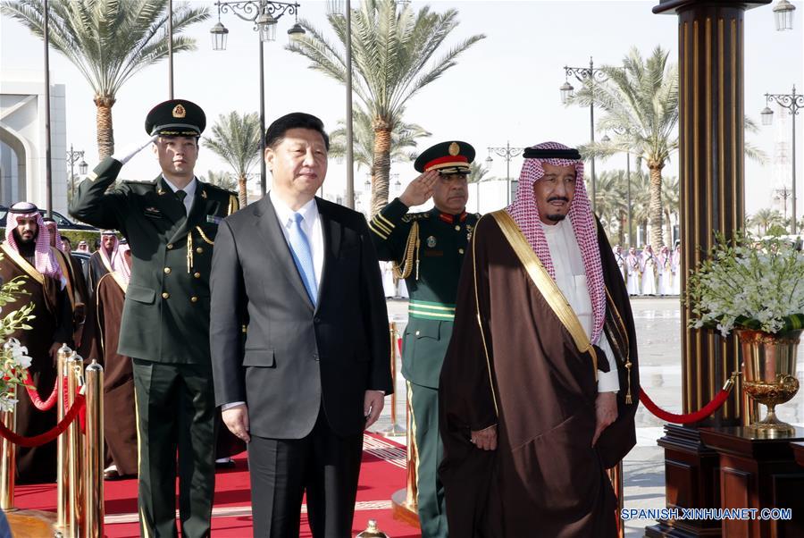 El presidente de China, Xi Jinping asiste a una ceremonia de bienvenida celebrada por el rey de Arabia SaudíSalman bin Abdulaziz Al Saud antes de sus conversaciones en Riad, Arabia Saudita, 19 de enero de 2016.(Xinhua / Ju Peng)