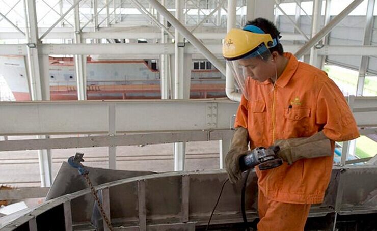 Los trabajadores de la empresa de yates de Zhongshan preparan en el río Perla un yate de lujo.