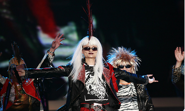 Jack Ma, presidente de Alibaba, actúa con un extra?o disfraz durante el 10o aniversario de Alibaba en un centro de deportes de Hangzhou, provincia de Zhejiang, el 10 de septiembre de 2009.