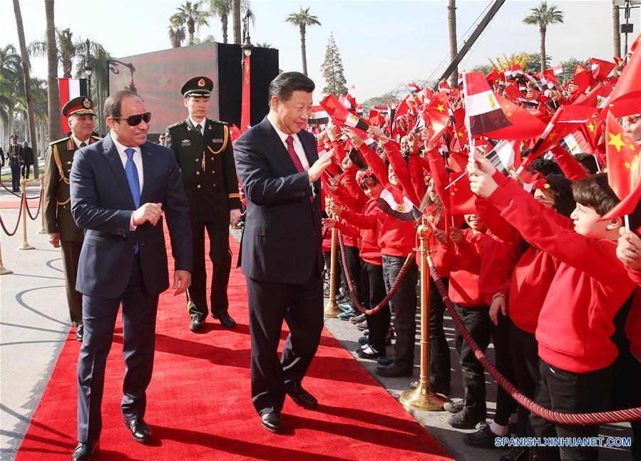 El presidente de China, Xi Jinping, asiste a una gran ceremonia de bienvenida antes de reunirse con el presidente egipcio, Abdel-Fattah al-Sisi fuera del Palacio de Quba en El Cairo, Egipto, 21 de enero de 2016. (Xinhua / Rao Aimin)
