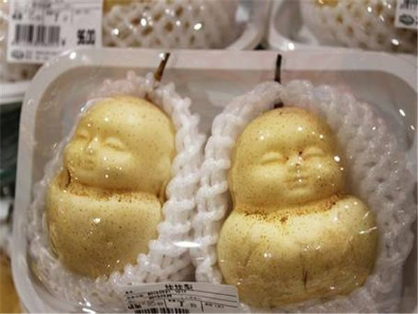 Con el lindo modelado y el caracter "Fu" (bendición) sobre el pecho de la figura, las peras “bebé” atraen a muchos clientes y están siendo consideradas como “el dios de fortuna” para los comerciantes locales.
