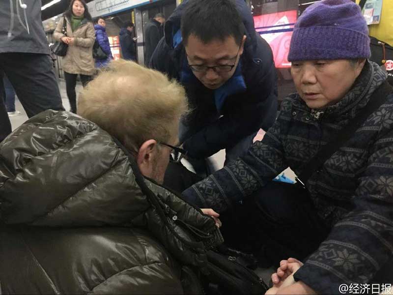 Una se?ora estimula sus puntos de acupuntura para reanimarle.