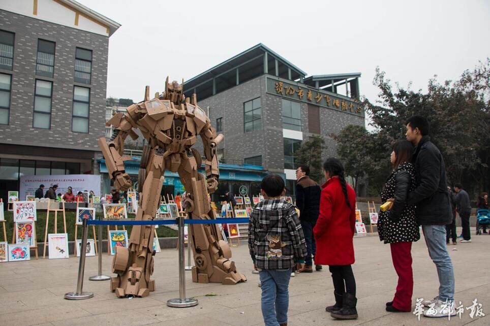 Xu Ou, de 35 a?os, construye un Transformer con más de 100 kilos de cajas de cartón en la ciudad de Ziyang, provincia de Sichuan. (Foto/West China Metropolis Daily)