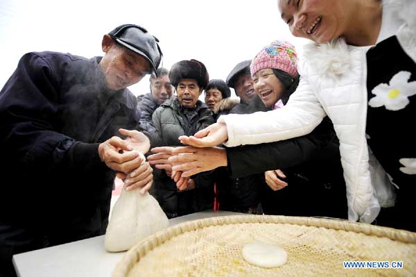 La gente hace "Ciba", un pastel de arroz glutinoso típico del Festival de Primavera, durante un espectáculo de cultura popular en Zhangjiajie, provincia de Hunan, el 18 de enero de 2014. [Foto/Xinhua]
