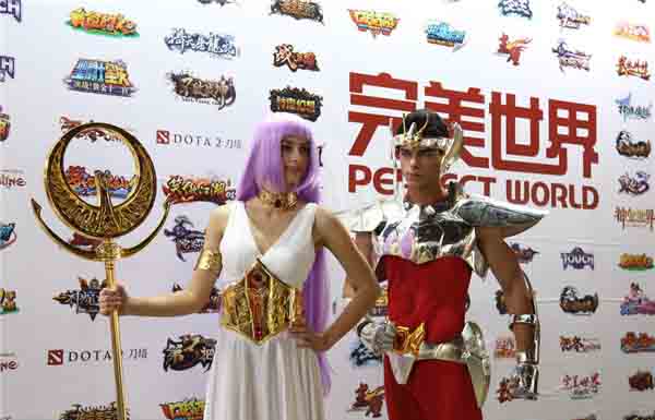 Animadores disfrazados posan en el pabellón de un desarrollador de juegos en línea y operador de Perfect World durante una exhibición en Beijing el 18 de octubre de 2014.