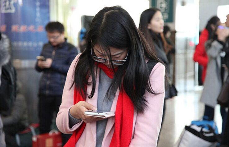 Una mujer utiliza su teléfono inteligente en una estación de tren en Xi'an, provincia de Shaanxi, 6 de febrero de 2016.