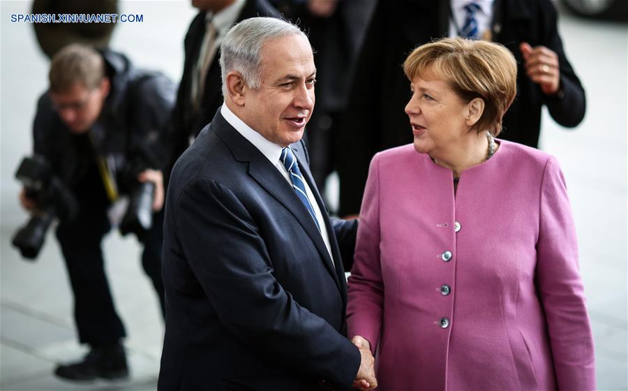 La canciller alemana, Angela Merkel y el primer ministro de Israel, Benjamin Netanyahu, asisten a una ceremonia de bienvenida en Berlín, Alemania, el 16 de febrero de 2016. (Xinhua / Zhang Fan)