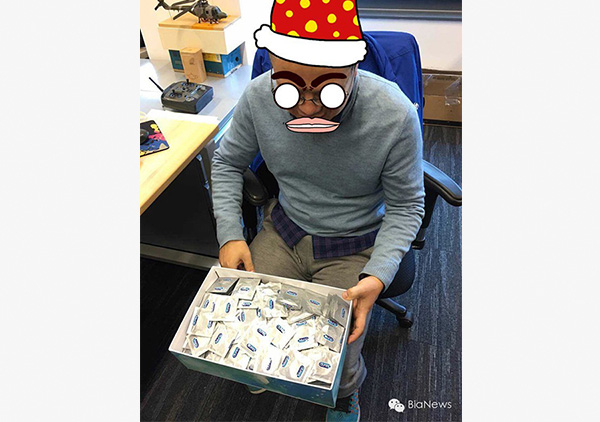 Un empleado de ZUK recibe una caja de preservativos de la compa?ía en el primer día de trabajo después del Festival de Primavera en Pekín, el 14 de febrero de 2016.[Foto/thepaper.cn]