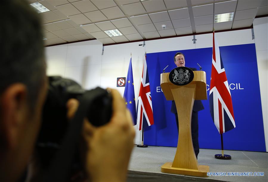 El primer ministro británico, David Cameron, se dirige a una conferencia de prensa al final de una cumbre de la UE de dos días extraordinaria en el Consejo Europeo en Bruselas, Bélgica, 19 de febrero de 2016.(Xinhua/Ye Pingfan)