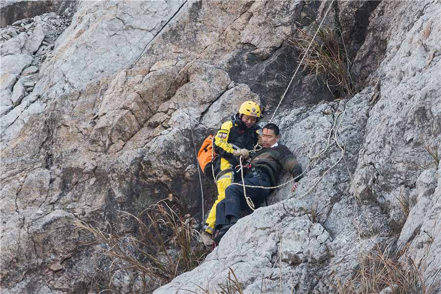 Policía de Hangzhou rescata a un hombre que quedó atrapado en un acantilado el 18 de febrero.