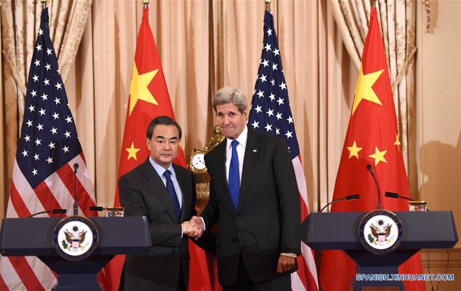 Secretario de EE.UU. Unidos John Kerry (R) y el ministro de Relaciones Exteriores de China, Wang Yi, asisten a una conferencia de prensa en Washington DC, Estados Unidos 23 de febrero 2016.(Xinhua/Yin Bogu)