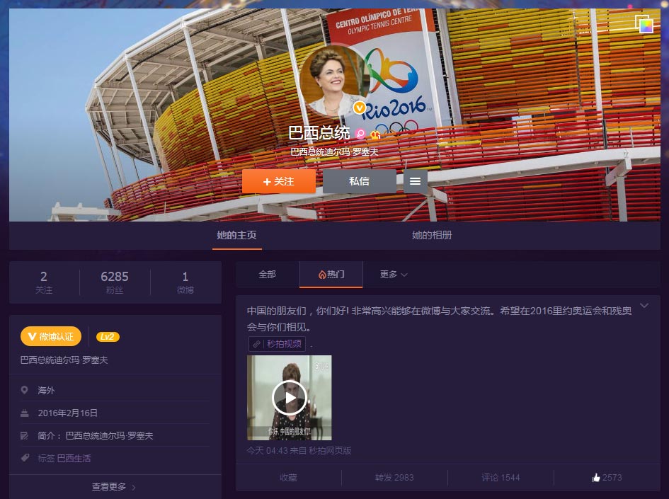 En su primera publicación, Rousseff colgó un vídeo de un minuto y medio en portugués subtitulado en chino invitando a los usuarios de la red china a asistir a los Juegos "junto a los seguidores del mundo entero" en esta "celebración de paz entre los pueblos".