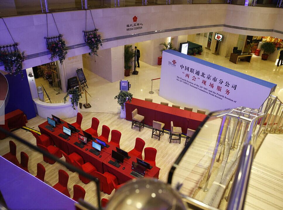 Los servicios de China Unicom para los medios de comunicación nacionales y extranjeros ya están listos en el centro de prensa de las “Dos Sesiones”, ubicado en el Beijing Media Center Hotel. [Foto: Chinanews.com]