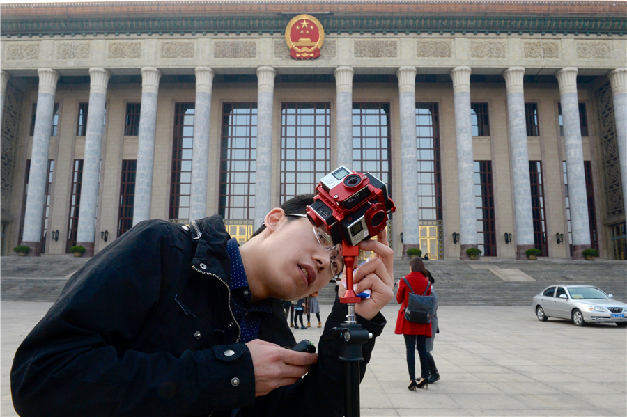 Beijing,04/03/2016(El Pueblo en Línea)- Un reportero prueba una cámara panorámica frente al Gran Palacio del Pueblo, previo a la conferencia de prensa de la II sesión anual de la CCPPCh, Beijing, 2 de marzo de 2016. [Foto: PPC]