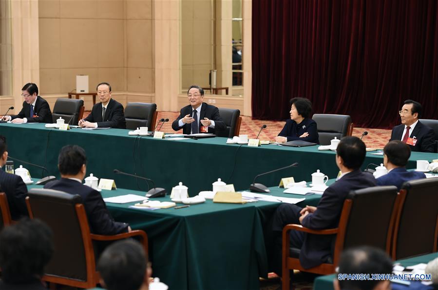 Yu Zhengsheng , presidente de la Conferencia Consultiva Política del Pueblo Chino, habla en una deliberación de un grupo de asesores políticos durante la sesión anual del máximo órgano asesor político del país en Beijing, capital de China, 6 de marzo de 2016. (Xinhua / Zhang Ling)