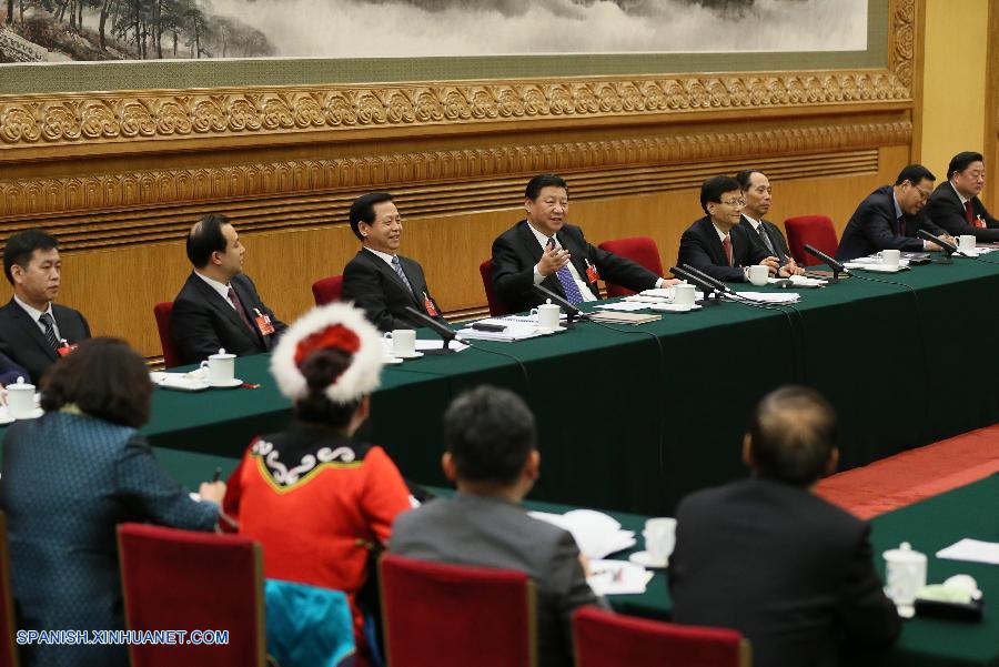 El presidente chino, Xi Jinping, se une a los legisladores provenientes de la provincia nororiental china de Heilongjiang para deliberar el informe sobre la labor del gobierno durante la sesión parlamentaria anual, en Beijing, China, el 7 de marzo de 2016. (Xinhua/Lan Hongguang)
