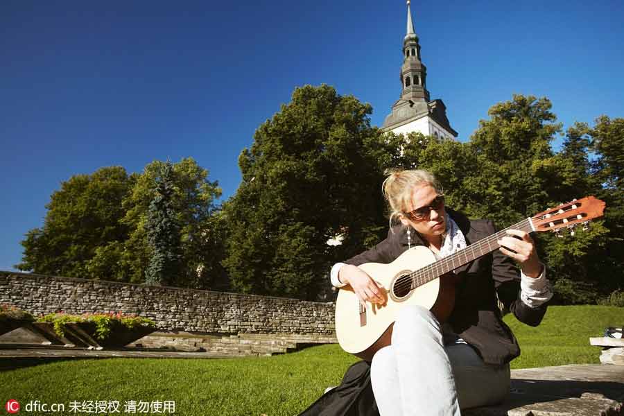 Mujer tocando la guitarra en frente de la Iglesia de Niguliste en Estonia, Europa del Este.