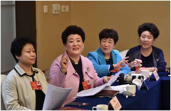 El 7 de marzo, la delegación de Liaoning examinó del informe de trabajo del gobierno. La atmósfera en la sala de reuniones era de entusiasmo, y todos los diputados se apresuraban por hablar. La diputada Li Yuhuan (segunda la izquierda) presentó varias sugerencias sobre la mejora del sistema de seguridad social de China. (Foto de Li Ge, Diario del Pueblo)
