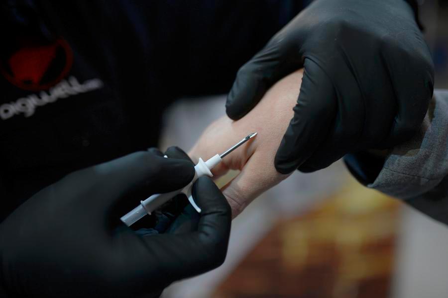 Un empleado de Digiwell muestra cómo se introduce un chip RFID en una mano humana, enCeBIT, la feria de ordenadores y software más grande del mundo, en Hannover, Alemania, el 13 de marzo de 2016. [Foto de agencias]