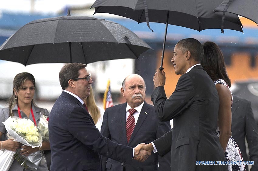 Bajo una pertinaz lluvia, Obama conversó brevemente con el ministro cubano, quien entregó ramos de flores a la esposa, hijas y suegra del mandatario norteamericano.