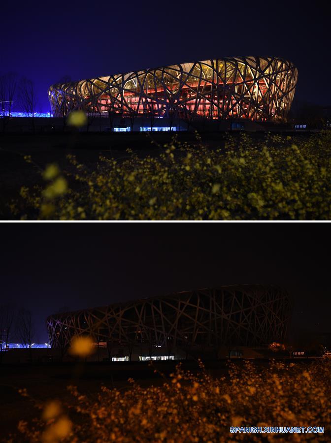 Foto combinada tomada el 19 de marzo el a?o 2016 muestra la jerarquía del pájaro, o el Estadio Nacional, apagar las luces durante la Hora del Planeta anual en Beijing, capital de China. (Xinhua / Ju Huanzong)