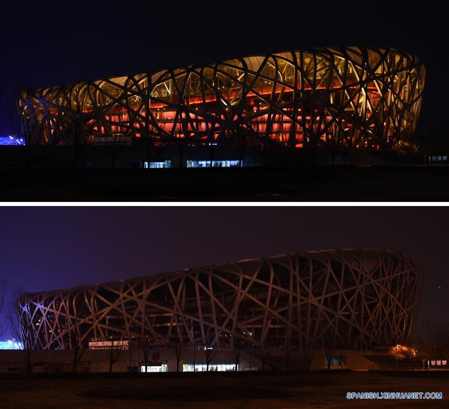 Foto combinada tomada el 19 de marzo el a?o 2016 muestra la jerarquía del pájaro, o el Estadio Nacional, apagar las luces durante la Hora del Planeta anual en Beijing, capital de China. (Xinhua / Ju Huanzong)