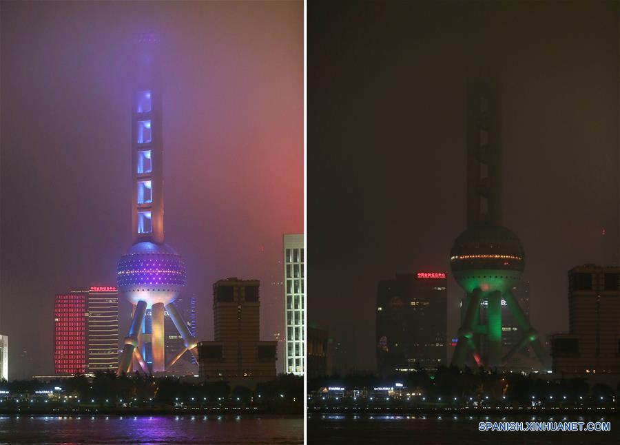 Foto combinada tomada el 19 de marzo el a?o 2016 muestra la Torre de la Perla Oriental apagar las luces durante la Hora del Planeta anual en Shanghai, China al este. (Xinhua / Ding Ting)