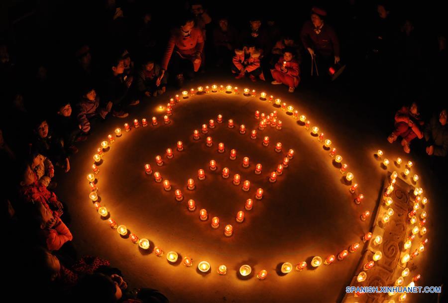 Los aldeanos forman la figura de "60" con velas durante la Hora del Planeta en Tangjiazhuang Pueblo de Xingtai, provincia de Hebei, norte de China, 19 de marzo de 2016. (Xinhua / Zhu Xudong)