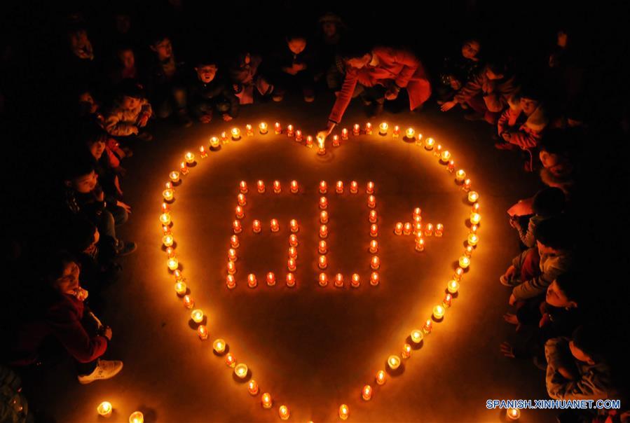 Los aldeanos forman la figura de "60" con velas durante la Hora del Planeta en Tangjiazhuang Pueblo de Xingtai, provincia de Hebei, norte de China, 19 de marzo de 2016. (Xinhua / Zhu Xudong)