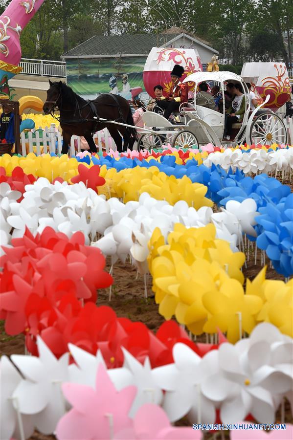 Turistas observan rehiletes de colores durante el Festival Internacional de Rehiletes, en Luoyang, en la provincia de Henan, en el centro de China, el 4 de abril de 2016. Un total de 500,000 rehiletes coloridos fueron colocados en distintas formas en el festival. (Xinhua/Li Bo)